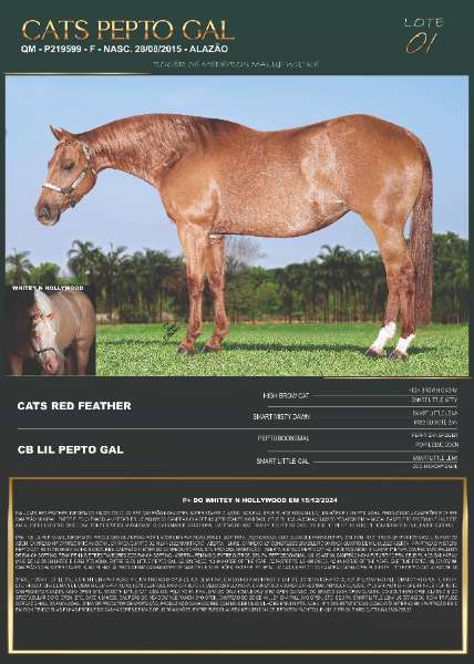 Mãe – CB LIL PEPTO GAL, IMPORTADA. PRODUTORA DE ANIMAIS PONTUADOS EM APARTAÇÃO, RANCH SORTING E LAÇO CABEÇA, COM DESTAQUE PARA KING GAL CAT FMM, R$ 21.470,00 EM GANHOS ANCA E 32 PONTOS ABQM. CAMPEÃO 45º CAMPEONATO NACIONAL DA RAÇA QUARTO DE MILHA 2022 APARTAÇÃO - ABERTA – LIVRE. CAMPEÃO 32º CONGRESSO BRASILEIRO DA RAÇA QUARTO DE MILHA 2023 ABERTA - APARTAÇÃO. MISTERY PEPTO CAT, R$ 11.780,00 EM GANHOS ANCA. RES. CAMPEÃO III ETAPA DO CAMPEONATO PAULISTA NPCA 2024 APARTAÇÃO – ABERTA. METALIC PEPTO CAT H2, 8 PONTOS ABQM. 3º LUGAR 1° ETAPA CAMPEONATO PAULISTA DE RANCH SORTING, TEAM PENING E TRES TAMBORES 2023 RANCH SORTING - ABERTA – FEMININO, ENTRE OUTROS. SEU PAI PEPTOBOONSMAL, U$180.487,00, CAMPEÃO NCHA FUTURITY OPEN. SEUS FILHOS GANHARAM MAIS DE U$ 28,2MILHÕES E 8.266 PTS AQHA, ENTRE ELES LITTLE PEPTO GAL, U$ 523.742,00, NCHA HORSE OF THE YEAR. COPASPEPTO, U$ 480.945,00, NCHA HORSE OF THE YEAR. ONE TIME PEPTO, U$ 331.097,00, CAMPEÃO NCHA SUPER STAKES. SUAS FILHAS JÁ PRODUZIRAM GANHADORES DE MAIS DE U$ 32 MILHÕES, ENTRE ELES METALLIC CAT, U$ 637.711,00, CAMPEÃO NCHA OPEN FUTURITY. LITTLE PEPTO CAT, U$ 670.291,00.