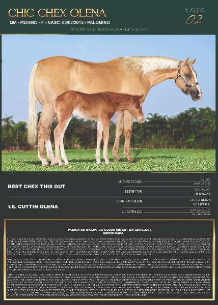 Pai – BEST CHEX THIS OUT, IMPORTADO, É FILHO DE NU CHEX TO CASH, QUE ACUMULOU U$ 67 MIL E É CAMPEÃO MUNDIAL NRHA, ALÉM DE SER PRODUTOR DE GANHADORES DE MAIS DE U$ 2,2 MILHÕES EM RÉDEAS E WORKING COW HORSE (WCH). É IRMÃO PATERNO DE WIMPYS LITTLE STEP, QUE GANHOU U$ 185 MIL. COM POUCOS FILHOS EM CAMPANHA, JÁ PRODUZIU 272,75 PONTOS ABQM EM 13 MODALIDADES, R$ 59.900,66 PELA ANCR, R$ 23.533,00 PELO SGP SISTEMA. COM DESTAQUES PARA NU CHEX MORE, RES. CAMPEÃ XLIII CAMPEONATO NACIONAL DA RAÇA QM - ARAÇATUBA EM LAÇO INDIVIDUAL TÉC - AMADOR - MASTER, RES. CAMPEÃ XL POTRO DO FUTURO DA RAÇA QM LAÇO INDIVIDUAL TÉC. - ABERTA - LIVRE, 3º .L 31º CONGRESSO BRASILEIRO DA RAÇA QM EM LAÇO INDIVIDUAL TÉC. - PROFISSIONAL - LIGHT, CAMPEÃ 30º CONGRESSO BRASILEIRO DA RAÇA QM EM LAÇO INDIVIDUAL TÉC. - ABERTA - JUNIOR, ETC. NU CHEX PLAYGIRLS, 43,50 PONTOS ABQM, RES. CAMPEÃ XLIII CAMPEONATO NACIONAL DA RAÇA QM LAÇO INDIVIDUAL TÉC - AB SR, CAMPEÃ 40º CAMPEONATO NACIONAL DA RAÇA QM LAÇO INDIVIDUAL TÉC - AB SR, CAMPEÃ 28º CONGRESSO BRASILEIRO DA RAÇA QM 2018 LAÇO INDIVIDUAL TÉC - AB SR, CAMPEÃ XXXVIII SHOW AQHA - CAMPEONATO NACIONAL 2020 - ARAÇATUBA LAÇO INDIVIDUAL TÉC - AB SR, ETC. LADY QUESTION CHEX, 34 PONTOS ABQM, 3º .L 5º POTRO DE OURO DE VAQUEJADA ASQM - 2013 CLASSE AB LV, 2º .L 2º ETAPA 7º CIRCUITO ASQM DE VAQUEJADA 2014 AB LV, 5º .L 6º POTRO OURODE VAQUEJADA ASQM 2014 AB LV, ETC.