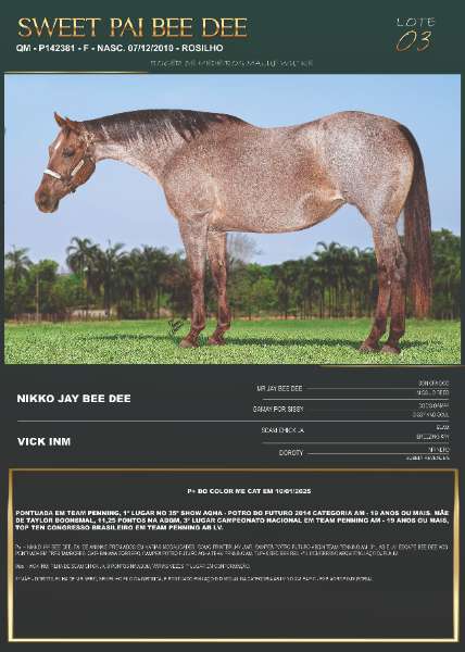 Pai – NIKKO JAY BEE DEE, PAI DE ANIMAIS PREMIADOS EM VÁRIAS MODALIDADES, COMO PRINTER JAY JWR, CAMPEÃ POTRO FUTURO ABQM TEAM PENNING AM, 3º.L AB E JV. ESCAPE BEE DEE ACS, PONTUADA EM TRÊS TAMBORES. GATA BAKANA ZORRERO, CAMPEÃ POTRO FUTURO AQHA TEAM PENNING AM. TUPAK RED BEE RBJ ,4º.L CONGRESSO ABQM 2016 LAÇO DUPLA JV.