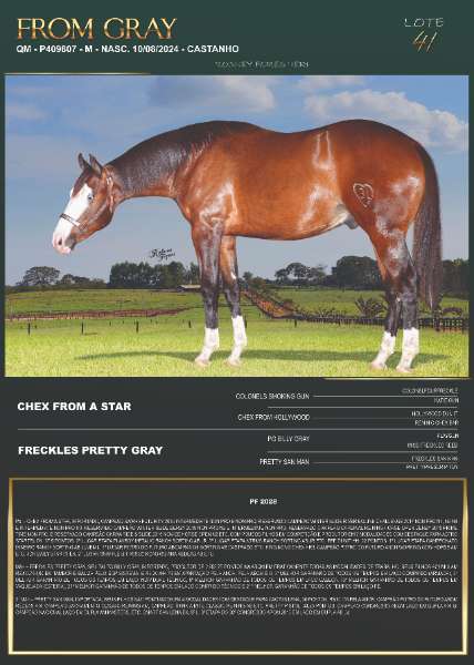 Mãe – FRECKLES PRETTY GRAY, SEU PAI PG BILLY GRAY, IMPORTADO, PRODUTOR DE 2.652,75 PONTOS NA ABQM EM PRATICAMENTE TODAS AS MODALIDADES DE TRABALHO. SEUS FILHOS ACUMULAM R$203.743,00 EM TAMBOR E BALIZA PELO SGP SISTEMA, E R$ 30.444,79 EM APARTAÇÃO PELA ANCA. PELA ABQM É O 3º MELHOR GARANHÃO DE TODOS OS TEMPOS EM LAÇO COMPRIDO (ARMADA), 3º MELHOR GARANHÃO DE TODOS OS TEMPOS EM LAÇO INDIVIDUAL TÉCNICO, 8º MELHOR GARANHÃO DE TODOS OS TEMPOS EM LAÇO CABEÇA, 13º MELHOR GARANHÃO DE TODOS OS TEMPOS EM VAQUEJADA (ESTEIRA), 21º MELHOR GARANHÃO DE TODOS OS TEMPOS EM LAÇO COMPRIDO TÉCNICO E 21º MELHOR GARANHÃO DE TODOS OS TEMPOS EM LAÇO PÉ.