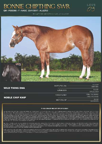 Pai – WILD THING DNA, IMPORTADO, GANHADOR DE U$ 109.061,00. CAMPEÃO WEST TX FUTURITY 4YO OPEN. SEUS FILHOS JÁ GANHARAM MAIS DE U$480 MIL EM APARTAÇÃO, RÉDEAS E WCH, ENTRE ELES: HEY GEORGY GIRL, U$ 132.580,00, FINALISTA NCHA OPEN FUTURITY E NCHA NON-PRO CLASSIC/CHALLENGE, CAMPEÃ SOUTH POINT WINTER AMATEUR DERBY, RES CAMPEÃ THE NON-PRO 4-YEAR-OLD AMATEUR, CAMPEÃ WEST TEXAS AMATEUR CLASSIC E 5°L OPEN, FINALISTA BREEDERS INV. OPEN DERBY, BRAZOS BASH OPEN DERBY, WEST TEXAS OPEN DERBY. WILDS MY THING, U$ 60.836,00, CAMPEÃO NCHA LTD OPEN DERBY. NO BRASIL É PRODUTOR DE 858,25 PONTOS PELA ABQM, ALÉM DE 17,5 PONTOS E R$ 20.671,86 EM GANHOS PELA ANCA, E R$ 32.235,07 EM GANHOS PELA ANCR, COM DESTAQUE PARA BRYAN HIGH BROW LENA, GANHADOR DE 283,5 PONTOS DE REGISTRO DE MÉRITO PELA ABQM, CAMPEÃO DO CONGRESSO BRASILEIRO ABQM 2024, RANCH SORTING – AMADOR FEMININO, 3º L. NA COPA DOS CAMPEÕES ABQM 2024, RANCH SORTING – AMADOR – CASTRADO. WILD PINK, R$6.654,13 PELA ANCA, CAMPEÃO DO POTRO DO FUTURO ANCA, CAT. ABERTA LTDA, CAMPEÃO NACIONAL ABQM APARTAÇÃO - CAVALO INICIANTE - CASTRADO. ELWOOD SPOOK THING, GANHADOR DE R$21.435,07 EM RÉDEAS PELA ANCR. CAMPEÃO SUPER STAKES ANCR 2023, CAT. AMADOR PRINCIPIANTE, 3º LUGAR NO POTRO DO FUTURO ANCR, CAT. ABERTA - N3, 4º LUGAR NO POTRO DO FUTURO ANCR, CAT. AMADOR - N4 E TOP 10 NO POTRO DO FUTURO ANCR, CAT. ABERTA - N4.