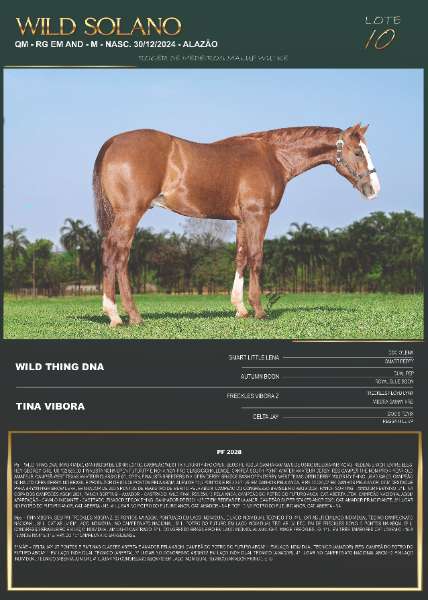 Pai – WILD THING DNA, IMPORTADO, GANHADOR DE U$ 109.061,00. CAMPEÃO WEST TX FUTURITY 4YO OPEN. SEUS FILHOS JÁ GANHARAM MAIS DE U$480 MIL EM APARTAÇÃO, RÉDEAS E WCH, ENTRE ELES: HEY GEORGY GIRL, U$ 132.580,00, FINALISTA NCHA OPEN FUTURITY E NCHA NON-PRO CLASSIC/CHALLENGE, CAMPEÃ SOUTH POINT WINTER AMATEUR DERBY, RES CAMPEÃ THE NON-PRO 4-YEAR-OLD AMATEUR, CAMPEÃ WEST TEXAS AMATEUR CLASSIC E 5°L OPEN, FINALISTA BREEDERS INV. OPEN DERBY, BRAZOS BASH OPEN DERBY, WEST TEXAS OPEN DERBY. WILDS MY THING, U$ 60.836,00, CAMPEÃO NCHA LTD OPEN DERBY. NO BRASIL É PRODUTOR DE 858,25 PONTOS PELA ABQM, ALÉM DE 17,5 PONTOS E R$ 20.671,86 EM GANHOS PELA ANCA, E R$ 32.235,07 EM GANHOS PELA ANCR, COM DESTAQUE PARA BRYAN HIGH BROW LENA, GANHADOR DE 283,5 PONTOS DE REGISTRO DE MÉRITO PELA ABQM, CAMPEÃO DO CONGRESSO BRASILEIRO ABQM 2024, RANCH SORTING – AMADOR FEMININO, 3º L. NA COPA DOS CAMPEÕES ABQM 2024, RANCH SORTING – AMADOR – CASTRADO. WILD PINK, R$6.654,13 PELA ANCA, CAMPEÃO DO POTRO DO FUTURO ANCA, CAT. ABERTA LTDA, CAMPEÃO NACIONAL ABQM APARTAÇÃO - CAVALO INICIANTE - CASTRADO. ELWOOD SPOOK THING, GANHADOR DE R$21.435,07 EM RÉDEAS PELA ANCR. CAMPEÃO SUPER STAKES ANCR 2023, CAT. AMADOR PRINCIPIANTE, 3º LUGAR NO POTRO DO FUTURO ANCR, CAT. ABERTA - N3, 4º LUGAR NO POTRO DO FUTURO ANCR, CAT. AMADOR - N4 E TOP 10 NO POTRO DO FUTURO ANCR, CAT. ABERTA - N4.