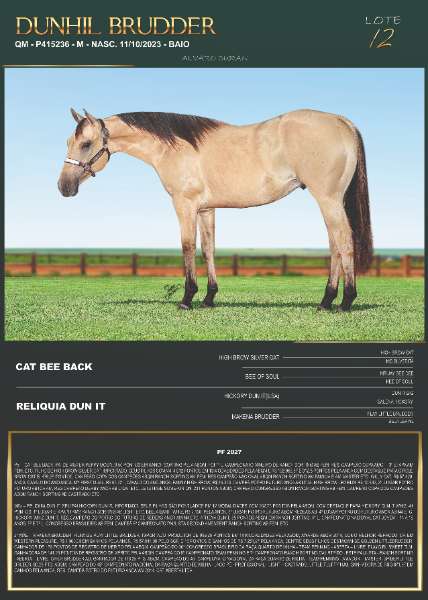 Pai – CAT BEE BACK, PAI DE MISTER PEPPY MOON, 9,50 PONTOS EM RANCH SORTING PELA ABQM, FOI 1º L. CAMPEONATO MINEIRO DE RANCH SORTING AB FEM, RES. CAMPEÃO COPA AMCT - 3º ETAPA AM FEM, ETC. FILHO DE HIGH BROW SILVER CAT, IMPORTADO. SEUS FILHOS SOMAM 4.012 PONTOS EM 13 MODALIDADES PELA ABQM E R$ 192.969,57 E 312,5 PONTOS PELA ANCA COM DESTAQUE PARA CIRCLE BROW CAT B, 476,25 PONTOS, CAMPEÃO COPA DOS CAMPEÕES ABQM RANCH SORTING AM FEM, RES CAMPEÃO NACIONAL ABQM RANCH SORTING AM FAMILIA E AM MASTER ETC. WILLY CAT, R$ 57.429, ANCA, CAVALO DO ANO ANCA. MY FIRST DUAL, R$ 65.221, CAVALO DO ANO ANCA. FANNY HIGH BROW, R$ 16.323, CAMPEÃ POTRO FUTURO ANCA AB LTDA. HIGH BROW LEO ELM, R$ 12.432, 3º .LUGAR POTRO FUTURO ABTCA AM, RES CAMPEÃO DERBY ANCA AB LTDA, ETC. LETS HAVE SOMEFUN ON, 231 PONTOS ABQM, CAMPEÃO CONGRESSO ABQM RANCH SORTING AB FEM, CAMPEÃO COPA DOS CAMPEÕES ABQM RANCH SORTING AB CASTRADO ETC.