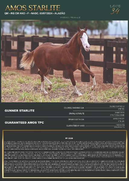 Pai – GUNNER STARLITE, GANHADOR DE R$11.900,00 PELA ANCR, CAMPEÃO NACIONAL ANCR 2019 ABERTA N4 E N3, TOP TEN POTRO DO FUTURO ABQM RÉDEAS ABERTA. PAI DE GUNNER GENE GOLD, CAMPEÃO 11º SEMANA DO CAVALO 2º ETAPA EM LAÇO CABEÇA AB JR. SEU PAI COLONELS SMOKING GUN, U$ 177.670, NRHA HALL OF FAME, RES CAMPEÃO NRHA OPEN FUTURITY, CAMPEÃO USET REINING FINALS, CAMPEÃO MUNDIAL APHA RÉDEAS AB JR, CAMPEÃO NRBC OPEN DERBY, NÚMERO 1 DO RANKING DE REPRODUTORES DE RÉDEAS, TENDO SEUS FILHOS GANHOS DE MAIS DE U$ 16 MILHÕES, COM DESTAQUE PARA DOWN RIGHT AMAZING U$950.409 EM RÉDEAS, CAMPEÃO DERBY NRHA OPEN L4, CAMPEÃO NRBC DERBY OPEN L4 ETC. CUSTOM MADE GUN U$420.690, CO CAMPEÃO RUN FOR A MILLION OPEN L4 ETC. GUNNATRASHYA, U$236,457, CAMPEÃO NRHA FUTURITY OPEN, CAMPEÃO NRHA DERBY OPEN ETC. GUNNERS SPECIAL NITE, U$ 219,700, RES CAMPEÃO NRHA FUTURITY OPEN ETC. CUSTOMIZED GUNNER, CO CAMPEÃ NRHA NON-PRO FUTURITY. GUNNER TINSELTOWN, U$302,000, RES. CAMPEÃO NRHA FUTURITY LEVEL 4 OPEN. TINKER WITH GUNS, U$336,200. AMERICASNEXTGUNMODEL, U$289,486, NO BRASIL É PAI DE GARANHÕES COMO: GUNNER BOY, GUNNER DUN IT AGAIN, MJ ROOSTERS GUN ETC.