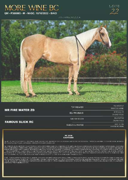Mãe – FAMOUS SLICK RC, IMPORTADA, 5º L. NA 3ª ETAPA DA VI COPA AVARÉ TAMBOR E BALIZA 2022, 3 TAMBORES CAT. PF ABERTA. SEU PAI SLICK BY DESIGN, U$ 621.639, EM 3 TAMBORES. CAMPEÃO MUNDIAL AQHA WORLD SHOW JUNIOR BARRELS, CAMPEÃO WPRA LARAMIE JUBILEE DAYS. SEUS FILHOS SOMAM U$7,6 MILHÕES COM DESTAQUE PARA: SLICKS LIL AMIGO U$328.95, SLICK N BLACK U$270.639, SLICK LANE TA FAME U$263.420, HYPER BY DESIGN U$246.700 ETC. NO BRASIL SEUS FILHOS SOMAM 3.522,50 PONTOS PELA ABQM E R$ 2.721.824,00 PELO SGP SISTEMA COM DESTAQUE PARA KICK BY FAME, 365,75 PONTOS, R$159.060,00 PELO SGP, 3º L. COPA DOS CAMPEÕES AM - 19 ANOS OU MAIS, 3X CAMPEÃO CAMPEONATO NACIONAL EM TRÊS TAMBORES NAS CATEGORIAS AM - 19 ANOS OU MAIS - CASTRADO / AB - FEM - CASTRADO / AB - GP ABQM - CASTRADO. WV CROWN SLICK, 317,5 PONTOS, R$329.509,00 PELO SGP, CAMPEÃO NACIONAL ABQM 3 TAMBORES PRÉ FUTURITY AB, CAMPEÃO GRAND PRIX RAPHAELA 3 TAMBORES POTRO DO FUTURO AB ETC. CAVANY SLICK, 199,25 PONTOS, R$102.455,00 PELO SGP, CAMPEÃO NACIONAL ABQM 3 TAMBORES AM LIGHT, RES CAMPEÃO NACIONAL ABQM 3 TAMBORES AB JR ETC.