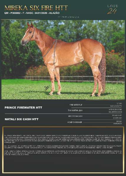 Mãe – NATALI SIX CASH HTT, 12 PONTOS DE RMT. FOI 1°L. 1ª PROVA DE 3 TAMBORES ESTANCIA IRMÃOZÃO TRÊS TAMBORES - ABERTA JUNIOR, 3°L. 4ª ETAPA DO CAMPEONATO DO NÚCLEO OESTE PAULISTA DO QUARTO DE TRÊS TAMBORES - ABERTA - CAVALO INICIANTE, 3°L. 14º CAMPEONATO DE TAMBOR E LAÇO DO RANCHO QUARTO DE MILHA TRÊS TAMBORES - ABERTA - CAVALO INICIANTE.