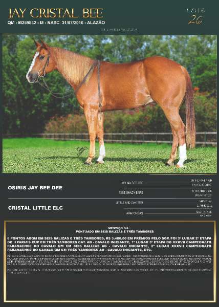 Mãe – CRISTAL LITTLE ELC, SEU PAI LITTLE AND OAK TMR, 18 PONTOS NA ABQM, 2X RES.CAMPEÃO NACIONAL ABQM EM LAÇO EM DUPLA CAT AMADOR LIGHT, 3º L. CAMPEONATO NACIONAL EM LAÇO EM DUPLA AMADOR - 19 ANOS OU MAIS, ETC.