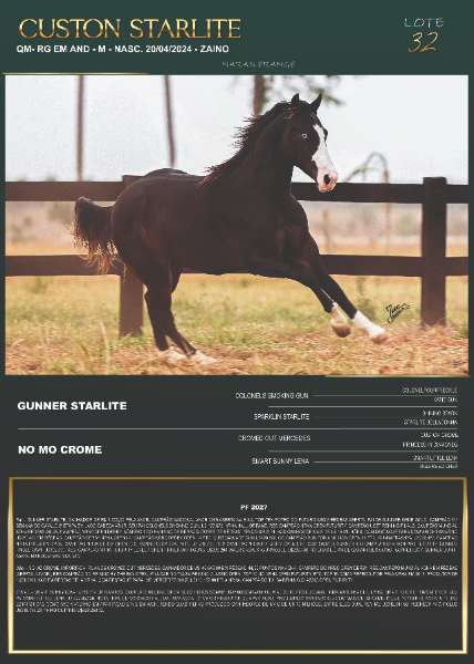 Pai – GUNNER STARLITE, GANHADOR DE R$11.900,00 PELA ANCR, CAMPEÃO NACIONAL ANCR 2019 ABERTA N4 E N3, TOP TEN POTRO DO FUTURO ABQM RÉDEAS ABERTA. PAI DE GUNNER GENE GOLD, CAMPEÃO 11º SEMANA DO CAVALO 2º ETAPA EM LAÇO CABEÇA AB JR. SEU PAI COLONELS SMOKING GUN, U$ 177.670, NRHA HALL OF FAME, RES CAMPEÃO NRHA OPEN FUTURITY, CAMPEÃO USET REINING FINALS, CAMPEÃO MUNDIAL APHA RÉDEAS AB JR, CAMPEÃO NRBC OPEN DERBY, NÚMERO 1 DO RANKING DE REPRODUTORES DE RÉDEAS, TENDO SEUS FILHOS GANHOS DE MAIS DE U$ 16 MILHÕES, COM DESTAQUE PARA DOWN RIGHT AMAZING U$950.409 EM RÉDEAS, CAMPEÃO DERBY NRHA OPEN L4, CAMPEÃO NRBC DERBY OPEN L4 ETC. CUSTOM MADE GUN U$420.690, CO CAMPEÃO RUN FOR A MILLION OPEN L4 ETC. GUNNATRASHYA, U$236,457, CAMPEÃO NRHA FUTURITY OPEN, CAMPEÃO NRHA DERBY OPEN ETC. GUNNERS SPECIAL NITE, U$ 219,700, RES CAMPEÃO NRHA FUTURITY OPEN ETC. CUSTOMIZED GUNNER, CO CAMPEÃ NRHA NON-PRO FUTURITY. GUNNER TINSELTOWN, U$302,000, RES. CAMPEÃO NRHA FUTURITY LEVEL 4 OPEN. TINKER WITH GUNS, U$336,200. AMERICASNEXTGUNMODEL, U$289,486, NO BRASIL É PAI DE GARANHÕES COMO: GUNNER BOY, GUNNER DUN IT AGAIN, MJ ROOSTERS GUN ETC.