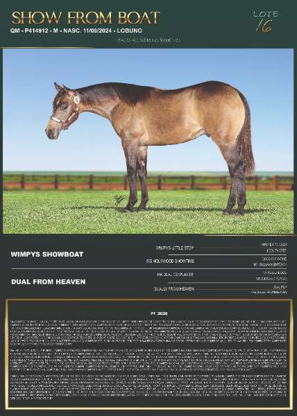 Pai – WIMPYS SHOWBOAT, U$39.276, EM RÉDEAS PELA NRHA, BICAMPEÃO DO LIBERTY REINING OPEN E INTERMEDIATE OPEN DERBIES, CAMPEÃO DO RMRHA SUMMER SLIDE OPEN MATURITY, RES. CAMPEÃO DO MIRHA REINERS BY THE BAY OPEN DERBY, RES. CAMPEÃO DO CACTUS REINING CLASSIC INTERMEDIATE OPEN MATURITY, RES. CAMPEÃO DO TULSA REINING CLASSIC OPEN CRI3, TOP 10 NO CAMPEONATO MUNDIAL AQHA EM RÉDEAS AB SR COM POUCOS FILHOS EM PISTA SEUS FILHOS SOMAM 230,50 PONTOS EM 7 MODALIDADES PELA ABQM COM DESTAQUE PARA ACRE DUAL BOAT, 66,25 PONTOS, RES CAMPEÃ DO POTRO DO FUTURO ABQM LAÇO COMPRIDO TÉCNICO AB, CAMPEÃ NACIONAL ABQM LAÇO COMPRIDO TEC AB LIGHT, RES CAMPEÃ CONGRESSO ABQM LAÇO COMPRIDO TÉCNICO AM ETC. HOLLY SHOWJAY HVS, 34 PONTOS, 1º LUGAR 2º ETAPA - 2º GRAN PIX ARENA PARTINERS TRÊS TAMBORES AB SR, 4º LUGAR 3º GRAND PRIX AB GP ABQM, 1º LUGAR 5º PROVA ARENA PARTNERS AB FEM, 3º LUGAR 6º PROVA ARENA PARTNERS AB GP ABQM, ETC. YASMIN BOAT HF, 28,25 PONTOS, CAMPEÃ DO POTRO DO FUTURO ABQM LAÇO COMPRIDO TÉCNICO AB LIGHT, 4º LUGAR CAMPEONATO NACIONAL ABQM LAÇO COMPRIDO TEC AB JR, ETC. SON OF SHOWSISSY, 27,5 PONTOS, 4º LUGAR POTRO DO FUTURO ABQM LAÇO COMPRIDO TÉC AB ETC. SHOWBOAT MOORE, 25,5 PONTOS, 1º LUGAR ETAPA CAMPEONATO PARANAENSE RANCH SORTING AM E AM FAMILIA, ETC. FOREST SHOWGRAY, 3,5 PONTOS 2º LUGAR ETAPA AMQM LAÇO COMPRIDO TEC AB LIGHT, 3º LUGAR LUGAR ETAPA AMQM LAÇO COMPRIDO ETC. FUNNY SHOWBOAT, 1 PONTO, 3º LUGAR PROVA FAZENDA MANAUS E RANCH FERRADURA LAÇO COMPRIDO AB LV. LEOLITA CASH FRN, RES CAMPEÃ ETAPA CAMPEONATO APQM DE LAÇO COMPRIDO TÉCNICO 2020 ABERTA JR ETC.