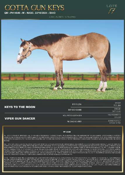 Mãe – VIPER GUN DANCER, SEU PAI HOLLYWOOD GOTTA GUN, IMPORTADO U$115.520 E 23 PONTOS NA AQHA EM RÉDEAS, RES CAMPEÃO DO CACTUS OPEN CLASSIC REINING, 4º LUGAR NO NRHA OPEN FUTURITY, FINALISTA DO NRHA OPEN DERBY E FINALISTA DO NRBC OPEN DERBY. SEUS FILHOS SOMAM 2.048,75 PONTOS EM 17 MODALIDADES E R$ 669.087,20 PELA ANCR, SENDO O TERCEIRO MAIOR PRODUTOR DE TODOS OS TEMPOS PELA ANCR, COM DESTAQUE PARA SNIPPER HOLLYGUN QR, R$155.450 PELA ANCR, CAMPEÃO POTRO DO FUTURO ANCR AB N4,N3,N2,N1 ETC. JUST IN HOLLYGUN QR, R$53.300, CAMPEÃO POTRO DO FUTURO ANCR 2019 AB N4. GSP WAS YOUR JOHNNY, R$36.481,39, CAMPEÃO POTRO DO FUTURO ANCR 2020 AB N4 ETC. HUNTER GOTTA GUN, 109,75 PONTOS, CAMPEÃO COPA DOS CAMPEÕES ABQM LAÇO CABEÇA AM MASTER, RES CAMPEÃO NACIONAL ABQM LAÇO CABEÇA AB LIGHT ETC. KATIE CAT DUN IT, 106,5 PONTOS, CAMPEÃ DERBY ABQM RANCH SORTING AB, RES CAMPEÃ NACIONAL ABQM RANCH SORTING AM MASTER ETC. GOTTA GUN PLAYER LEC, 90 PONTOS, CAMPEÃO SHOW AQHA POTRO DO FUTURO AB LAÇO PÉ, RES CAMPEÃO NACIONAL ABQM LAÇO EM DUPLA ETC. PRINCESS GOTTA FRN, 51,5 PONTOS ABQM, CAMPEÃ POTRO DO FUTURO ABQM LAÇO COMPRIDO AM ETC.