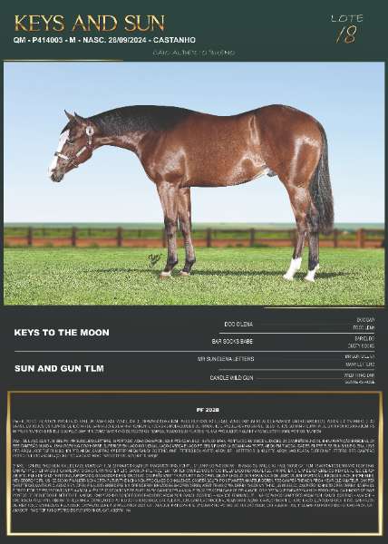 Pai – KEYS TO THE MOON, IMPORTADO, HALL DA FAMA ABQM, VENCEDOR DE 10 AWARDS DA ABQM, PAI DE REPRODUTORES QUE VENCERAM UM TOTAL DE 5 AWARDS, UM DOS MAIORES E VERSÁTEIS GARANHÕES DO BRASIL EM TODOS OS TEMPOS, SENDO PAI DE GANHADORES EM PRATICAMENTE TODAS AS MODALIDADES DE TRABALHO E VAQUEJADA NO BRASIL, SEUS FILHOS SOMAM A QUANTIA DE 3.470 PONTOS NA ABQM, R$ 66.778,16 NA ANCA E R$ 45.212,50 PELO SGP, Nº 8 COMO MAIOR AVÔ DE TODOS OS TEMPOS, TENDO SEUS FILHOS E FILHAS PRODUZIDO A QUANTIA ACIMA DOS 11,9 MIL PONTOS NA ABQM.