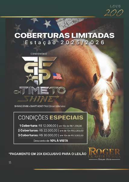 IMPORTADO, U$ 60.000 EM RÉDEAS. CAMPEÃO ALL AMERICAN QH CONGRESS INT OPEN ETC. SEUS FILHOS SOMAM 592,75 PONTOS EM 13 MODALIDADES COM DESTAQUE PARA CH TIME TO BELLE, 68 PONTOS, CAMPEÃO POTRO DO FUTURO ABQM LAÇO PÉ AB LIGHT CASTRADO, CAMPEÃO POTRO DO FUTURO ABQM LAÇO PÉ AM LIGHT ETC. ULTRA SHINE HOT, 52,5 PONTOS, 1º LUGAR ETAPA COPA AMCT RANCH SORTING AM, 1º LUGAR ETAPA CAMPEONATO MINEIRO TEAM PENNING AB LV ETC. GREAT TIMES, 40,25 PONTOS 1º LUGAR ETAPA NNPQM TEAM PENNING AB, 2º LUGAR ETAPA NNPQM RANCH SORTING POTRO DO FUTURO AB ETC. SHINE GIRL GUNNER, 25,25 PONTOS CAMPEÃ PRÉ FUTURITY ABQM TEAM PENNING AB. LACE CAT, 13,5 PONTOS, CAMPEÃ POTRO DO FUTURO ABQM LAÇO COMPRIDO TÉCNICO AB LIGHT, 4º LUGAR CAMPEONATO SUL MATOGROSSENSE LAÇO COMPRIDO TÉCNICO AB JR ETC. PAKAR TO SHINE 25,25 PONTOS, CAMPEÃO POTRO DO FUTURO ANCH AB, CAMPEÃO NACIONAL ABQM WORKING COW HORSE AB JR, CAMPEÃO DERBY ANCH AB, CAMPEÃO COPA DOS CAMPEÕES ABQM WORKING COW HORSE AB JR ETC.