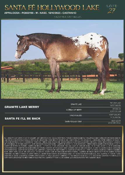 Pai – GRANITE LAKE MERRY, FILHO DE GRANITE LAKE, IMPORTADO, FOI GANHADOR E PRODUTOR NOS ESTADOS UNIDOS, E EM APENAS CINCO GERAÇÕES PRODUZIU MAIS DE US$2.000.000, COM DESTAQUE PARA CHI TER (SI-106 - US$376,608), COLD GRANITE STONE (SI-109 - US$222,583), FLY ON LAKE (SI-103 - US$199.387), ENTRE OUTROS. NO BRASIL É O MELHOR REPRODUTOR DE CORRIDA DE TODOS OS TEMPOS, COM FILHOS QUE SOMAM GANHOS SUPERIORES A MILHÕES. DESTAQUE PARA GUAPA GRANITE, AAAT-105, MELHOR ANIMAL DE 2015 NO JOCKEY CLUB DE SOROCABA ESTREANTE/GERAL. CAMPEÃ GP JOCKEY CLUB DE SOROCABA - TORNEIO INÍCIO, CAMPEÃ GP BRAZILIAN FUTURITY, CAMPEÃ GP POTRO DO FUTURO, CAMPEÃ GP BRASIL – II TRÍPLICE, 2ª GP MEGARACE. TAU JQM, AAAT-100, MELHOR ANIMAL DE 2017 NO JOCKEY CLUB DE SOROCABA ESTREANTE/GERAL. CAMPEÃO GP ABQM POTRO DO FUTURO, CAMPEÃO GP MEGARACE. MORE GRANITE, AAAT-107, MELHOR ANIMAL DE 2012 NO JOCKEY CLUB DE SOROCABA ESTREANTE/GERAL, CAMPEÃO GP CAMPEÃO DOS CAMPEÕES, CAMPEÃO GP ENCERRAMENTO, CAMPEÃO GP SÃO PAULO - I TRÍPLICE COROA, CAMPEÃO TORNEIO EVOLUTION RACE. PARTY HARD, AAA-97, MELHOR ANIMAL DE 2021 NO JOCKEY CLUB DE SOROCABA ESTREANTE/GERAL, CAMPEÃO GP BRAZILIAN FUTURITY ENTRE MUITOS OUTROS CAMPEÕES. SUA MÃE A STREAK OF MERRY, PRODUZIU MERRY DASH FISHERS, 45,50 PONTOS ABQM, RMT SUPERIOR AB EM VAQUEJADA, RES. CAMPEÃO 3º ETAPA FUTUROS CAMPEÕES ALQM AB LV, CAMPEÃO 3º ETAPA DERBY ACQMPE DE VAQUEJADA AB LV, CAMPEÃO 1º ETAPA CIRCUITO ALQM AB LV, ETC. SEIS MERRY, CAMPEÃO 1º ETAPA NUCLEO NORTE MATO-GROSSENSE EM TRÊS TAMBORES AB FEM, RES. CAMPEÃO 1º ETAPA NUCLEO NORTE MATO-GROSSENSE EM TRÊS TAMBORES AB JR.